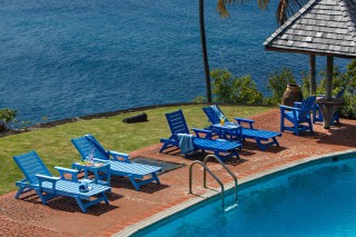 Following the walkway from the Big Room toward the ocean, the deep fish-shaped pool is set in a red tiled patio surrounded by colorful local flora. The pool babbles quietly as cool water overflows from a 19th century cauldron once used for sugar refinery on the island. Lying on the outermost point of the promontory, the entire patio takes advantage of the beautiful view of ocean sunsets and the wildly arching mountains beyond. Brightly colored lounging chairs face out to the bay and a small shaded table is perfect for resting cocktails and playing a game of cards.